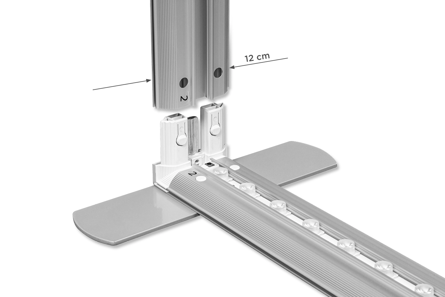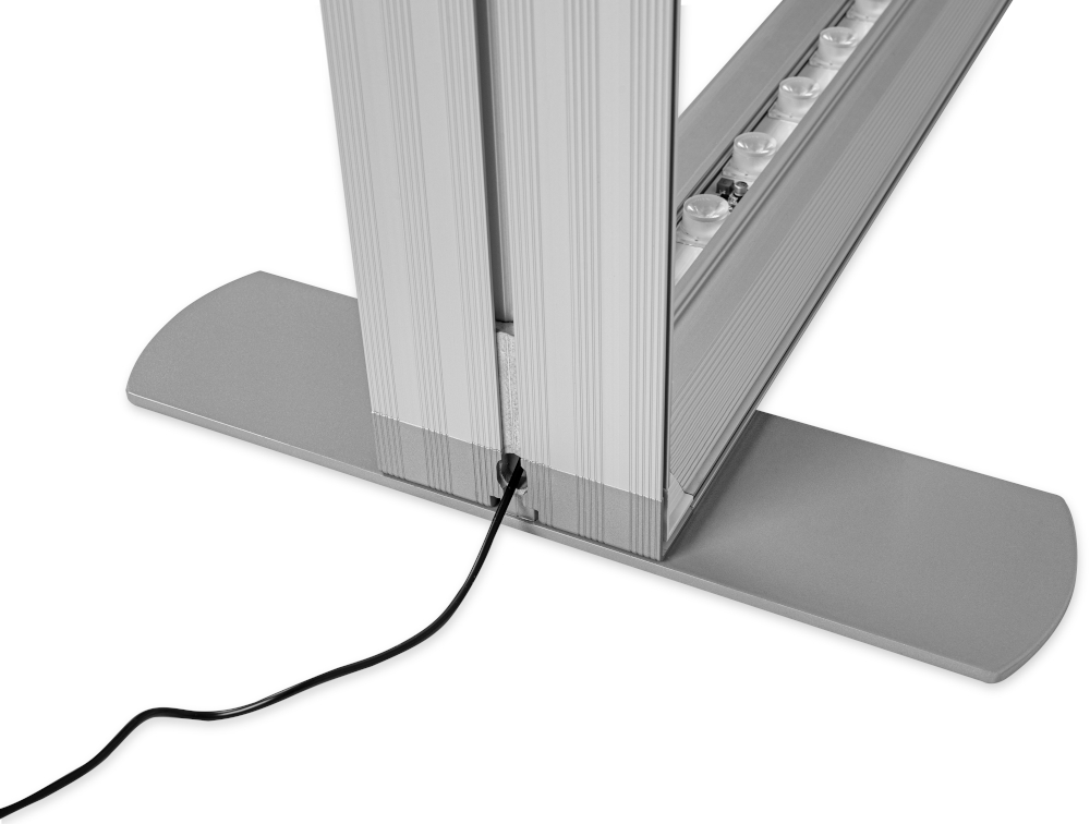 Trybunka została wykonana z mocnego aluminium anodowanego, co gwarantuje jej wysoką jakość oraz długi czas użytkowania. Jej złożenie nie wymaga użycia narzędzi i zajmuje dosłownie kilka sekund. Mocowanie grafiki za pomocą taśmy silikonowej to z kolei pewność błyskawicznego i prostego montażu wydruku. Dzięki wmontowanym żarówkom LED cała trybunka jest idealnie doświetlona i z daleka zwraca uwagę przechodniów.
