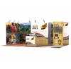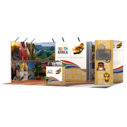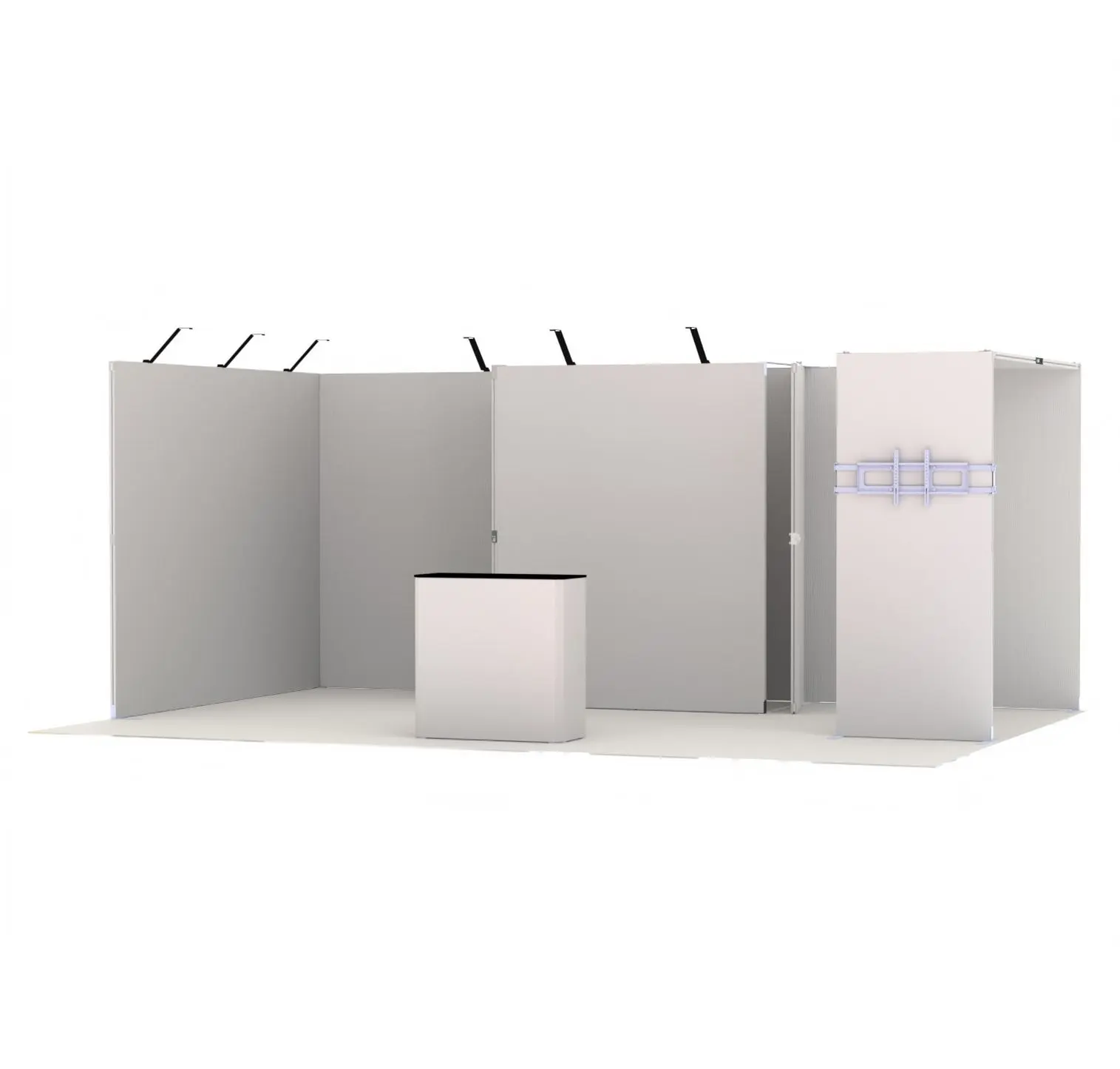 W skład zestawu wchodzą: dwa moduły 95x250 cm, trzynaście modułów 100x250 cm, uchwyt TV, zestaw dedykowanych łączyn i konektorów, lada FastFrame oraz torby transportowe. Podłoga nie jest elementem wyposażenia i nie wchodzi w skład stoiska.