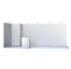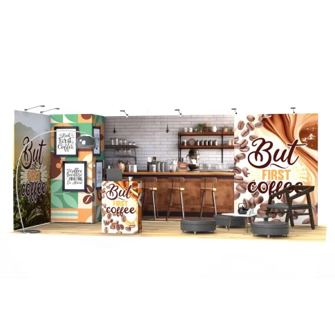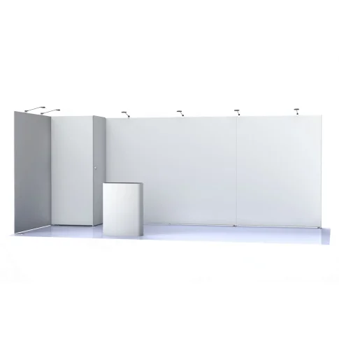 W skład zestawu wchodzą: dwa moduły 200 cm, dwa moduły 80 cm, dwa moduły 100 cm, moduł 300 cm, moduł drzwi, lada InstaLED oraz dedykowane torby transportowe. Podłoga nie jest elementem wyposażenia i nie wchodzi w skład stoiska.